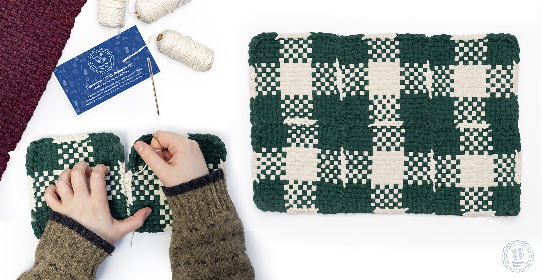 The Friendly Loom® Potholder Stitch Together Kit provides the essentials — a metal tapestry needle, 100% cotton thread, and step-by-step instructions to join your woven potholders together to create something more, like a beautiful handmade kitchen mat.