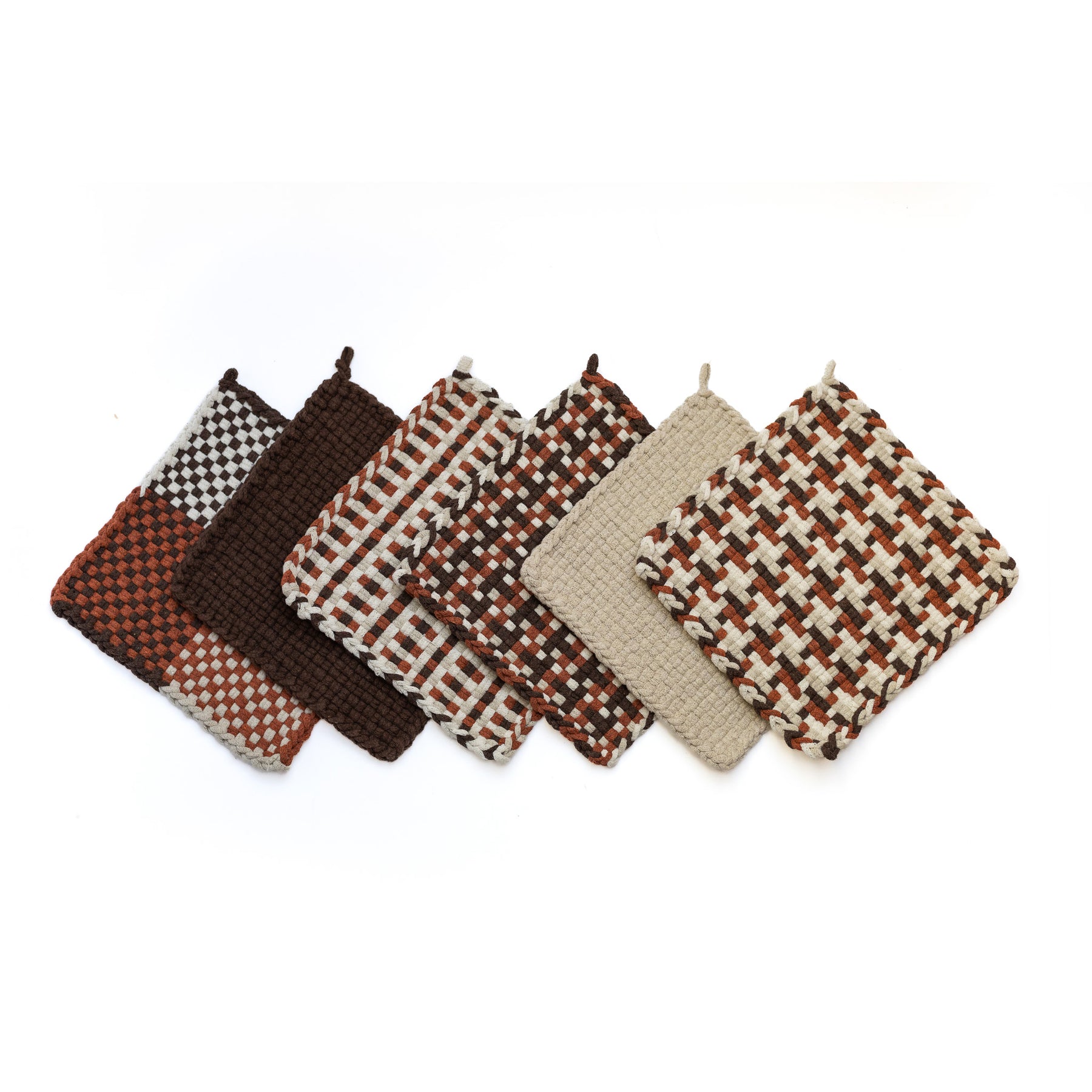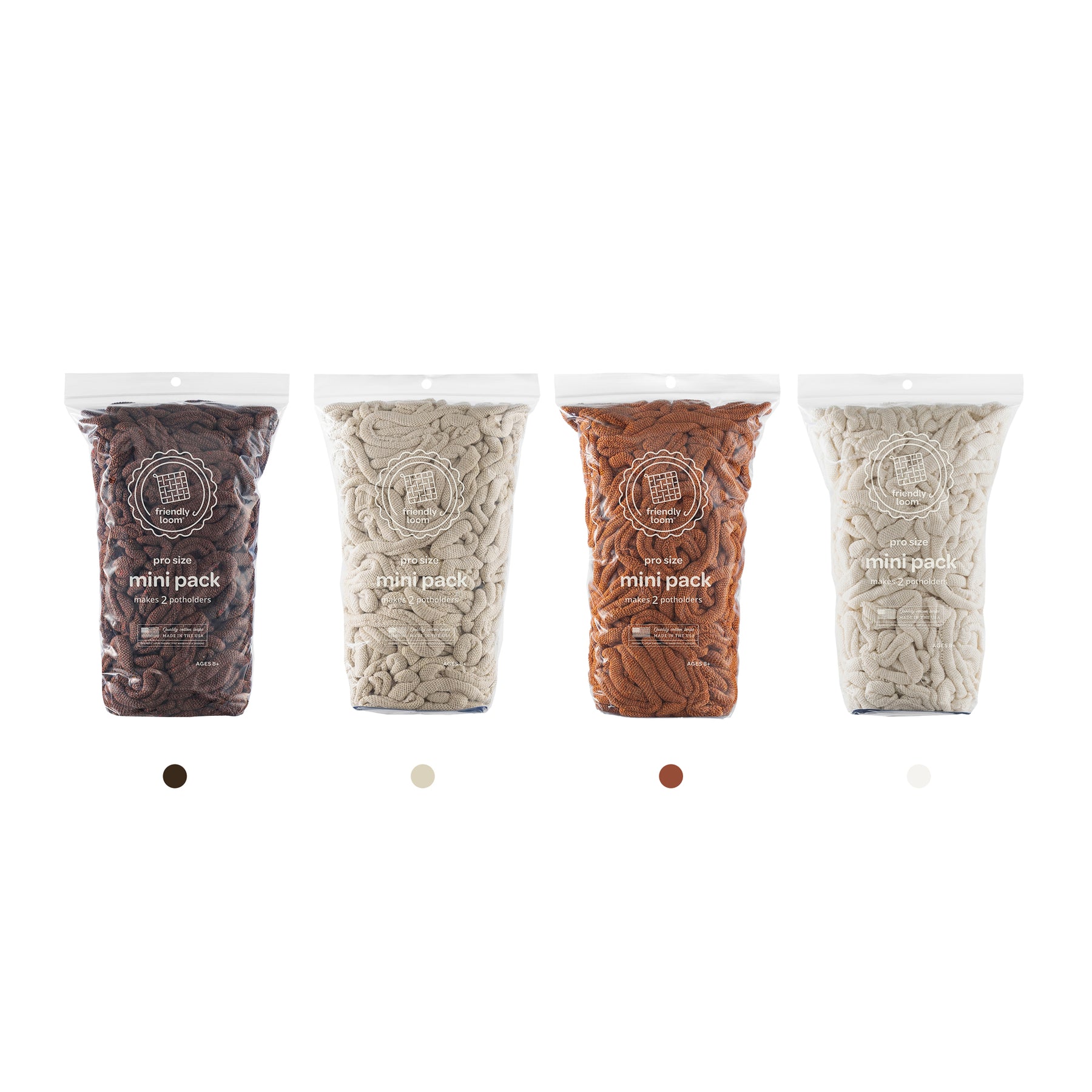 This pack makes up to 8 potholders on the 10”x 10” PRO Loom. It includes 4 bags of PRO-sized cotton loops in Chocolate, Flax, Spice, Winter White—one bag of each color. Made in the USA, we take great pride in the quality of our loops and are confident you'll find them to be the best available.