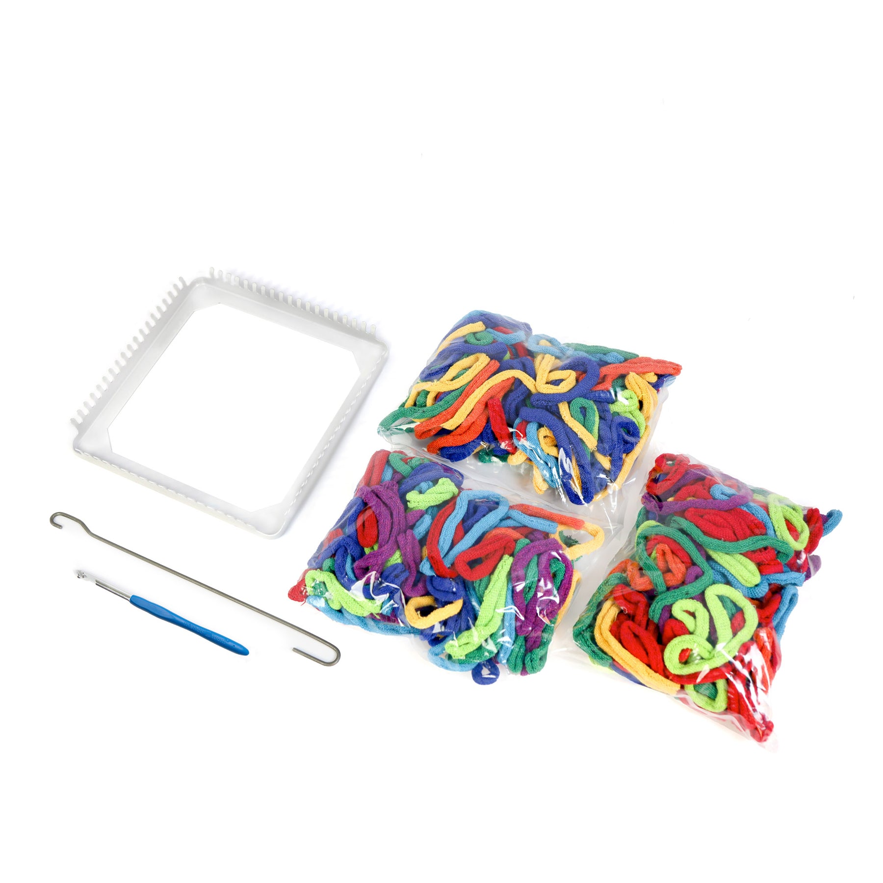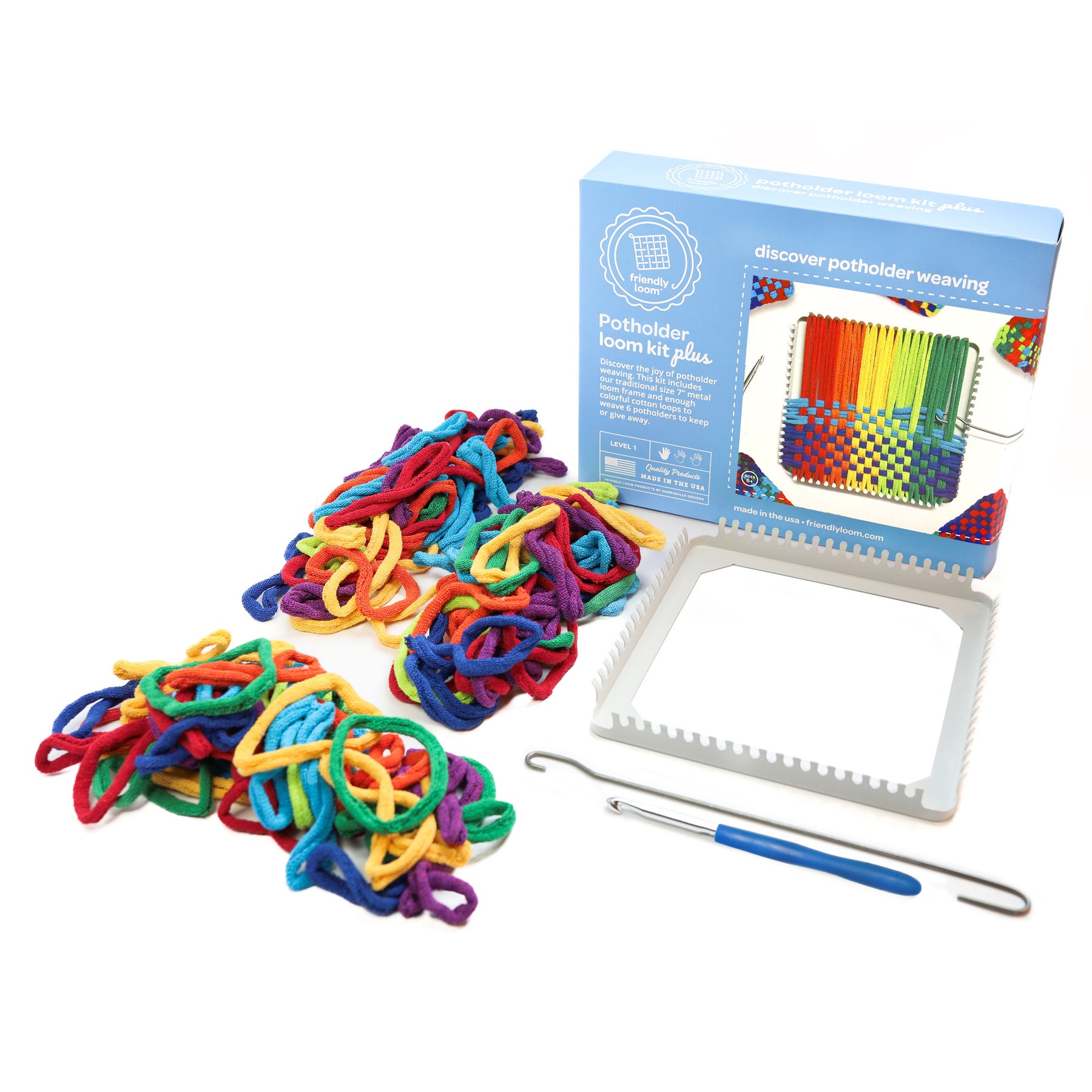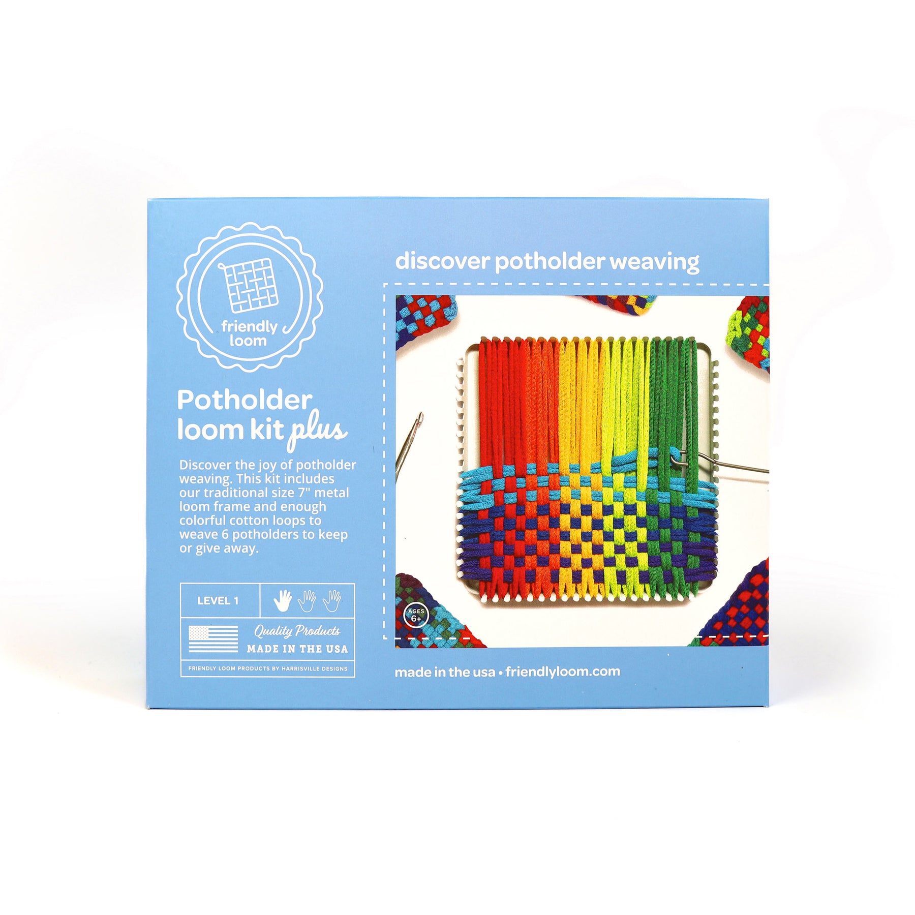 Our Plus loom kit has enough quality cotton loops to make 6 potholders and is made of metal, not plastic! The loom's curved peg design helps the loops stay secure as you weave.
